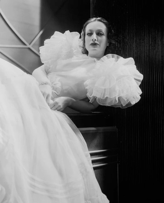 Moving away from the Chanel "garconne" look of the 1920s, women of this decade returned to more feminine shapes in their wardrobes. The puff sleeve was said to help bring back the curves of a woman’s body, while also helping to create a curve if the woman didn’t have one. According to Elizabeth Leese in Costume Design in the Movies, Joan Crawford wore a puff-sleeved gown in the movie Letty Lynton which popular department store Macy’s replicated--and they ended up selling 500 thousand dresses nationwide.