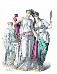 Inner tunic that was worn by women was a “peplos”. It was made of wool and had clasps at shoulders. The upper part of the peplos was folded down to the waist and formed so-called apoptygma. Chiton was lighter tunic, often pleated, made of linen and worn by both genders and all ages. Chitons also had knee-length for men and ankle-length for women.