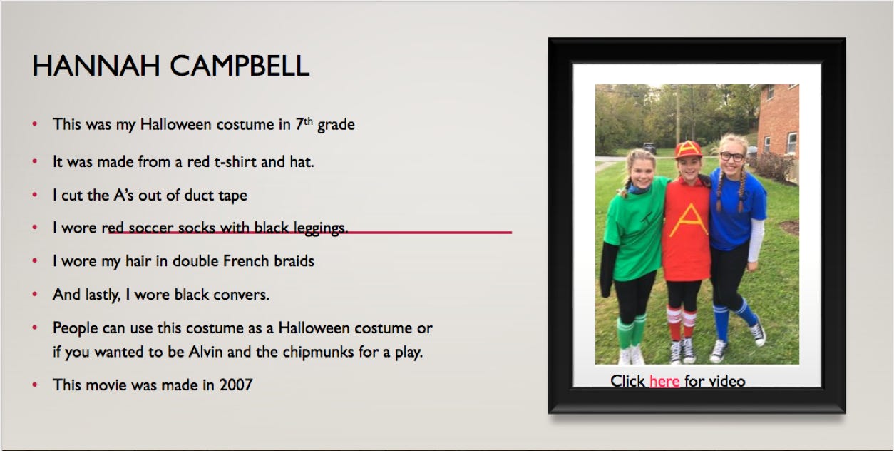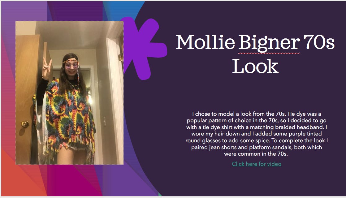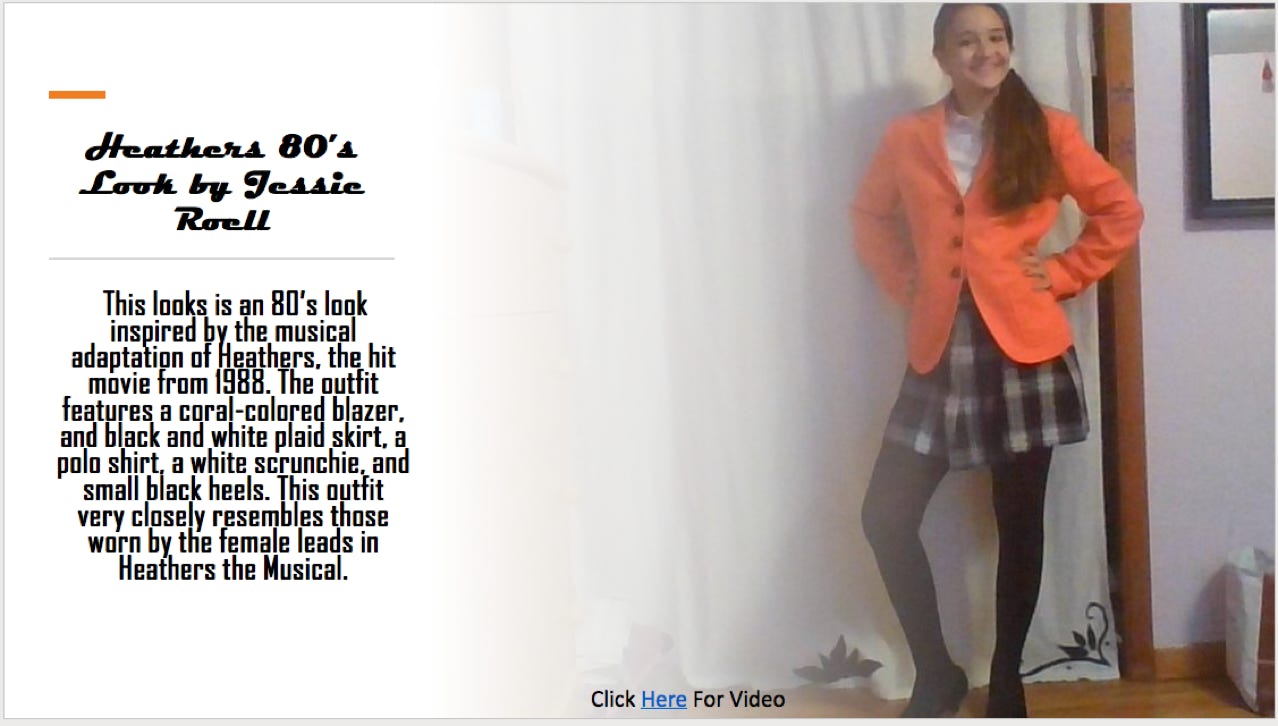 I want you to create a powerpoint slide with a “LOOK”. The look could be a dress that you own, a costume that you wore or you can pull something together that you feel has some story to it. Your may describe a “Look” as a costume defining the pieces or let me know in your description what the costume or fashion represents (ie. Movie, Play or time period). Let me know the pieces that you have brought together and how they help the look.