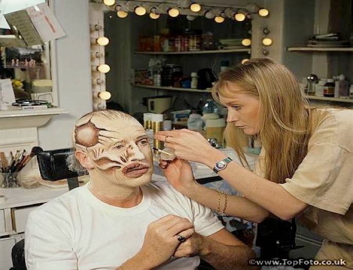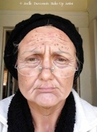 Through the use of makeup, specifically highlighting and shading, the apparent shape of an actor’s face can be changed. By highlighting the face's protruding bones, the features become pronounced; shadowing cavities can add depth. Sagging jowls, forehead wrinkles, eye pouches, and prominent veins can be created by manipulating highlights and shadows. A highlight is a base makeup that is at least two shades lighter than the base. It is applied on the bridge of the nose, cheekbones, and areas under the eyes and below the brows.[4] Using a color two shades deeper than the base provides depth and definition. This depth is commonly used on the eye sockets, to thin the sides of the nose, to shallow the cheeks, and to minimize heaviness under the chin.