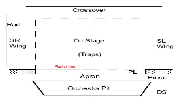 The plaster line runs across the stage at the back face (upstage face) of the proscenium wall.