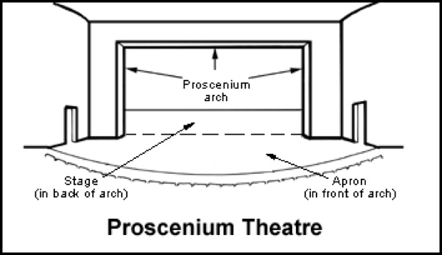 The metaphorical vertical plane of space in a theatre, usually surrounded on the top and sides by a physical proscenium arch (whether or not truly "arched") and on the bottom by the stage floor itself, which serves as the frame into which the audience observes from a more or less unified angle the events taking place upon the stage during a theatrical performance.