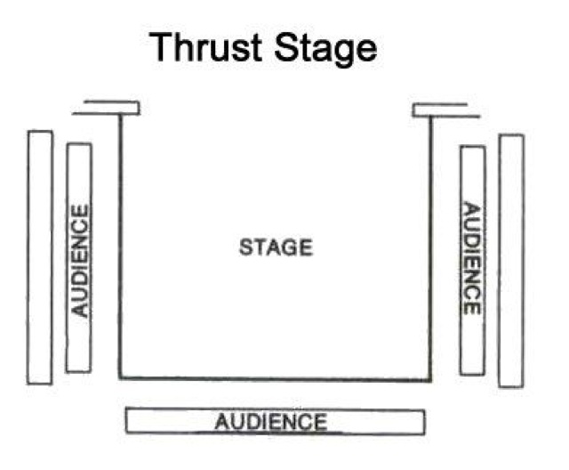 A thrust stage (also known as a platform stage or open stage)[1] is one that extends into the audience on three sides and is connected to the backstage area by its upstage end. A thrust has the benefit of greater intimacy between performers and the audience than a proscenium, while retaining the utility of a backstage area.